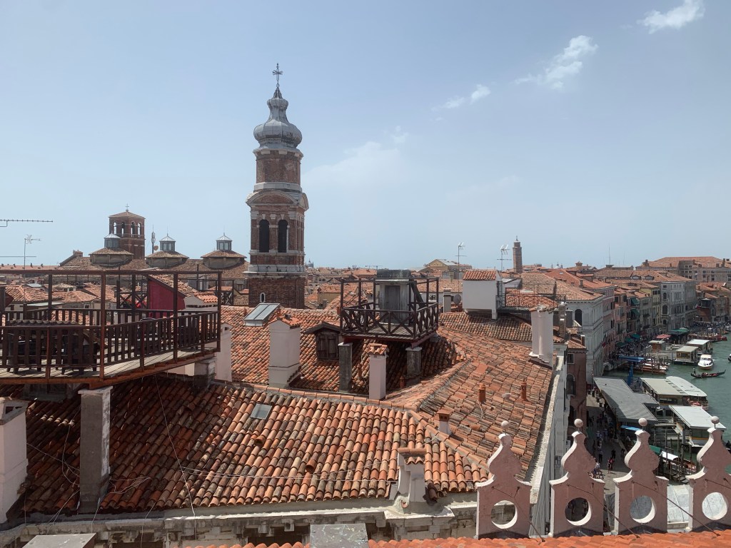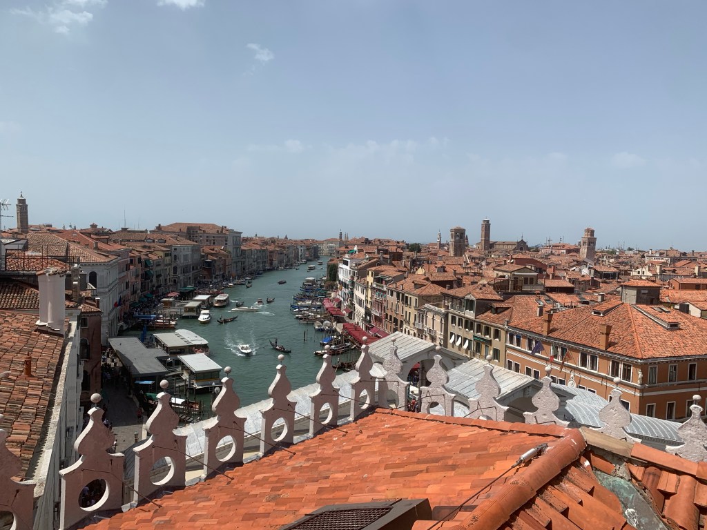Intre timp s-a făcut spre ora 12. Ca să ajungem pe terasa clădirii fondaco dei tedeschi – clădire care se află fix lângă podul Rialto – am luat o scară rulantă roșie, până la ultimul etaj. Clădirea în sine este o mică operă de artă, un palat în toată regula care aduce puțin cu Galeriile Lafayette din Paris.