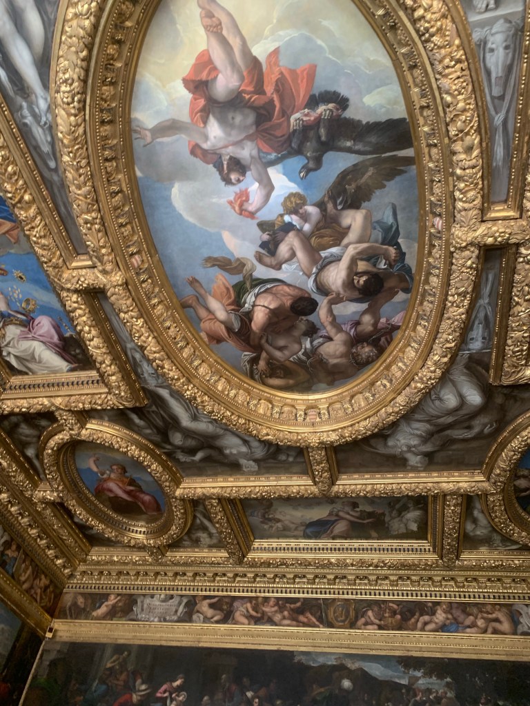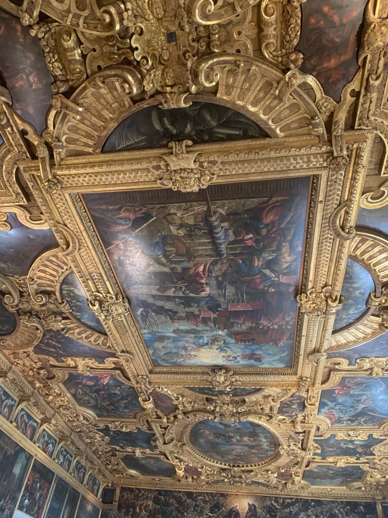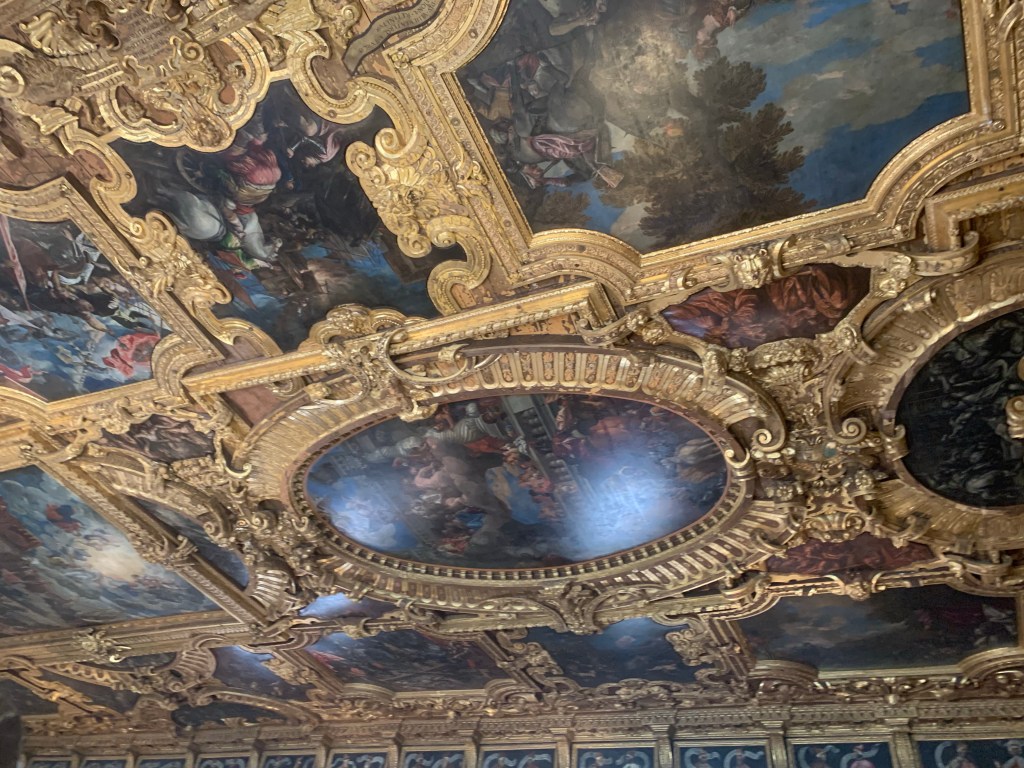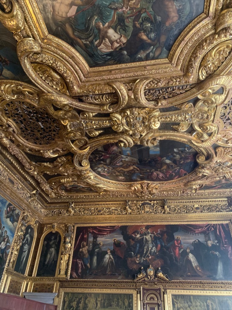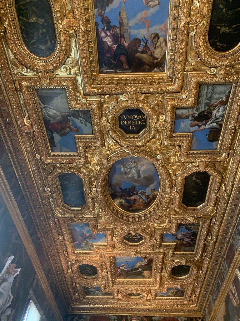 Am intrat în palatul Dogilor și ne-am plimbat prin nenumărate săli dotate cu niște tavane excepțional de frumoase. Pentru că nu toate sălile aveau aer condiționat, ferestrele deschise larg mă atrăgeau ca un magnet. Dacă se nimerea să găsesc un loc liber la geam, mă așezam, îmi făceam vânt cu pălăria pe post de evantai, priveam curțile interioare și mă întrebam de unde și până unde ideea de a face din tavan locul cel mai strălucitor al unei încăperi. Acum, privind retrospectiv și aducându-mi aminte de câteva dintre bisericile vizitate – în mod deosebit cele romane – realizez că tavanele din palatul Dogilor semănau cu cupolele bisericilor, la fel de bogate în culori, ca și cum acolo sus, se petrecea, pe vremuri, adevărata frumusețe a lumii.
