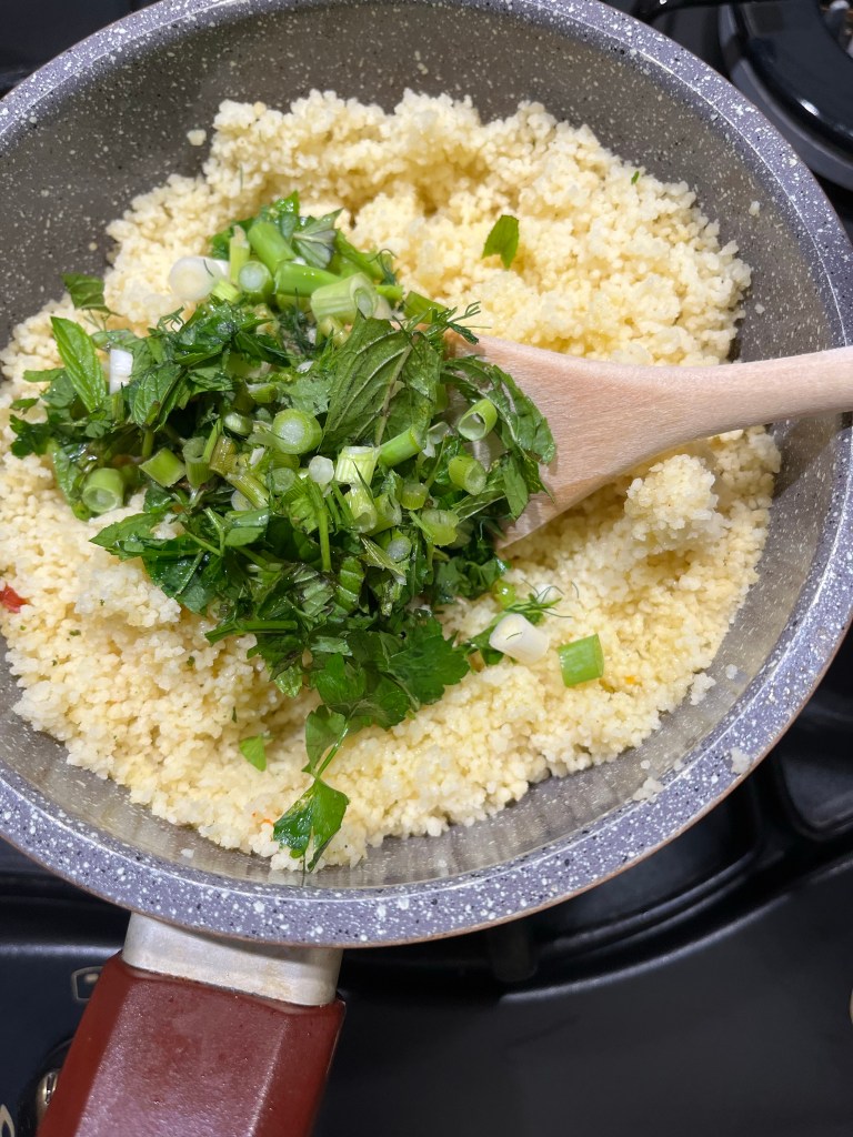 După 25 de minute, am amestecat couscous-ul cu ulei de măsline și verdețurile tăiate mărunt, după care am adăugat jumătate din sucul de lămâie. Ce-a ieșit? Un deliciu!
