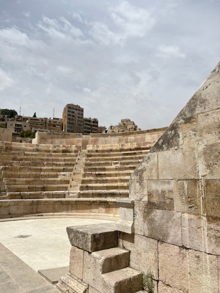După masă, am pornit să vizităm Amman-ul. Am descoperit un oraș amestecat care tocmai ce se topea sub un soare dogoritor. Partea dinspre teatrul Roman / moschee / souk este darapanata și murdara. Multe dintre clădiri sunt nelocuite, lăsate în paragină. Strada principală – care traversează Amman-ul – are în această zonă din oraș 6 benzi, trei pe un sens, trei pe celalalt sens și, pe o distanță de 1 km, nu există un semafor. Pentru că parcarea era în fața hotelului, dar pe partea cealaltă a strazii principale, deci 6 benzi peste, a trebuit, atunci și în cele 5 zile care au urmat, să ne luăm inima în dinți și să jonglam cu traficul. Partea proastă a fost că traficul în Amman este infernal în orice moment al zilei. Partea bună a fost instinctul nostru de supraviețuire.