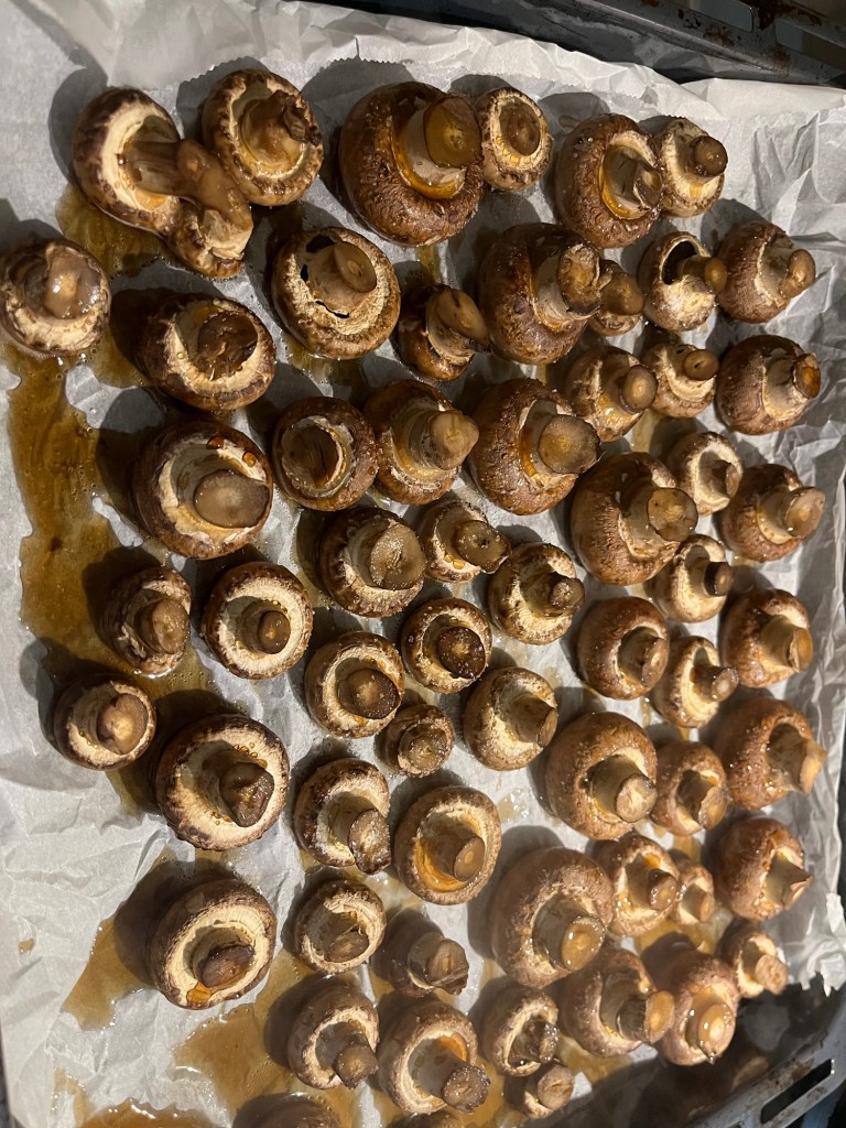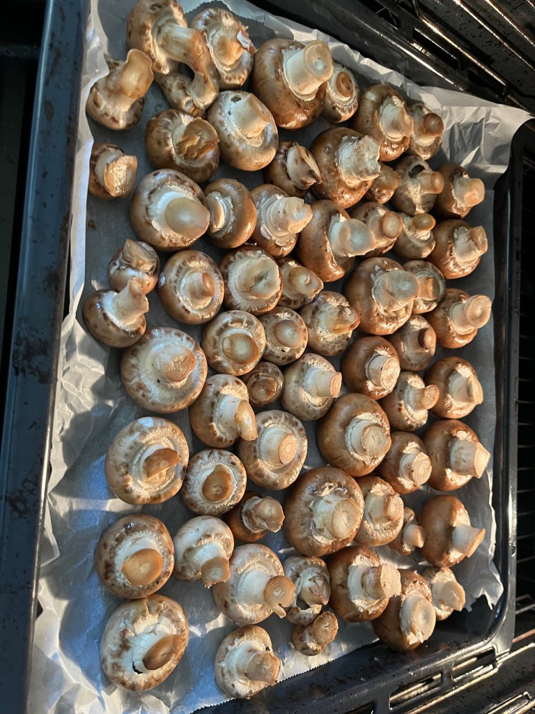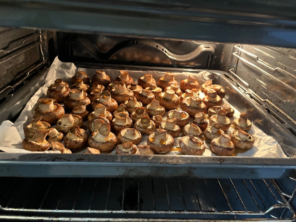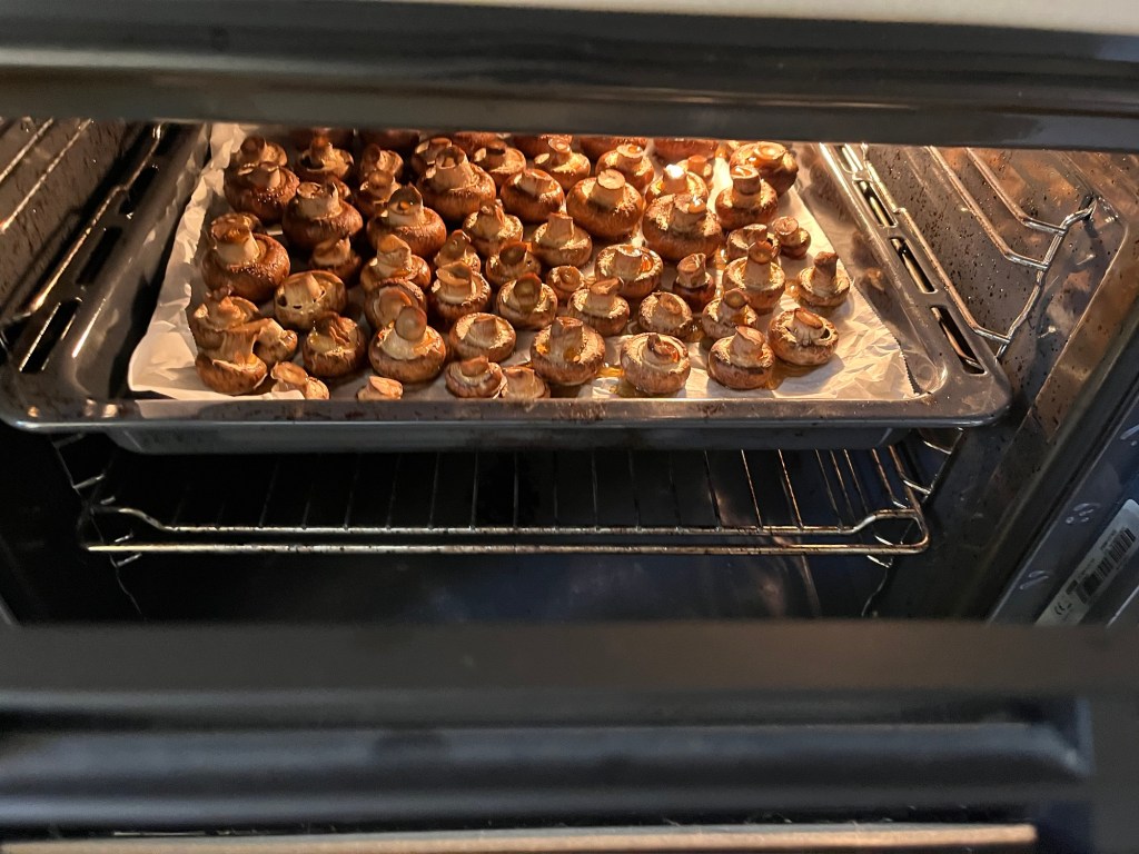 Se spală ciupercile după care, întregi, se pun pe hârtie de copt la cuptor, 15 minute, 200 de grade, încălzire sus-jos, cu ventilație.