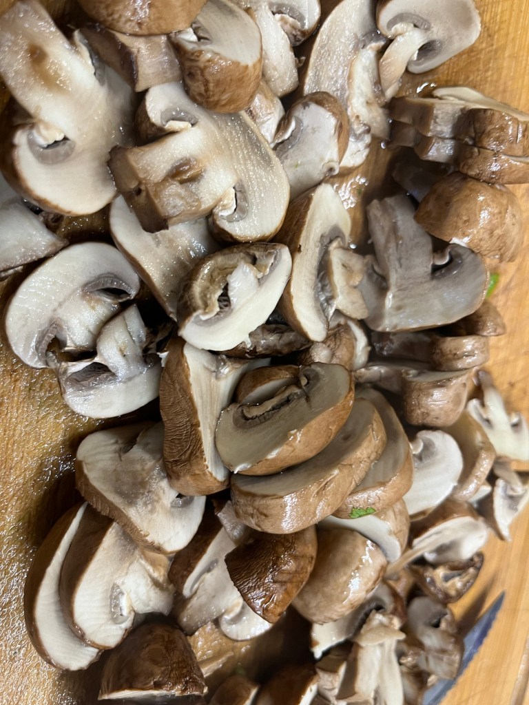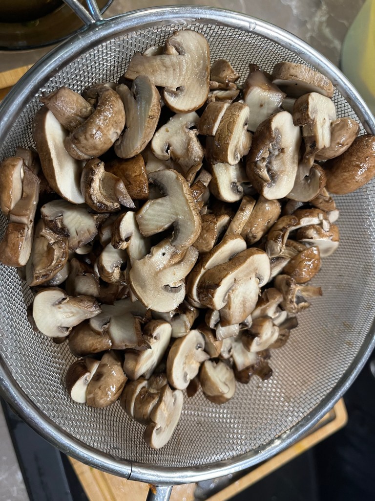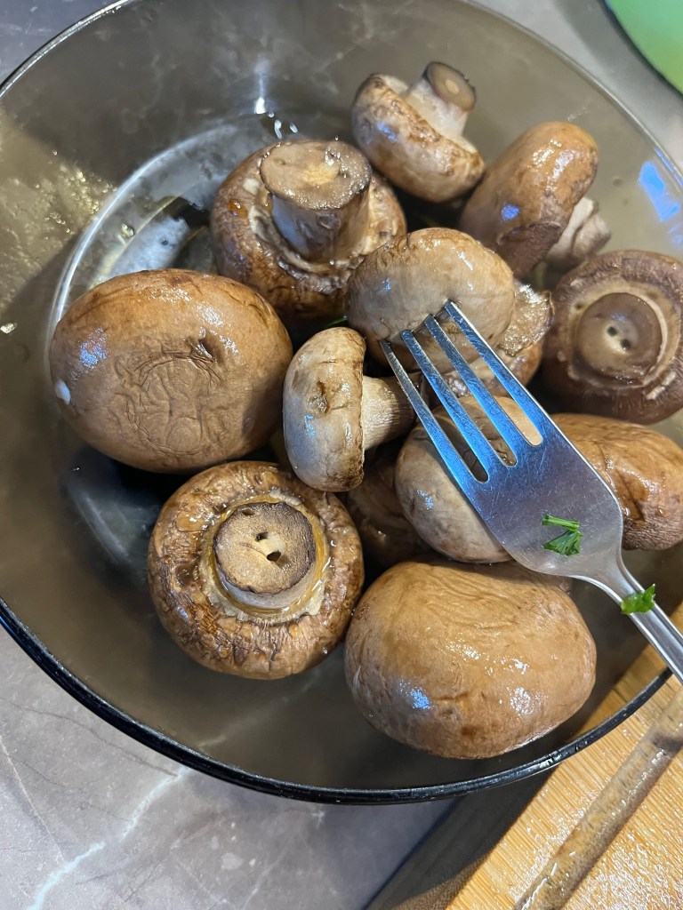În timp ce se răcesc și se scurg ciupercile, se pun măslinele într-un castron, se taie pătrunjelul și se amestecă cu măslinele.