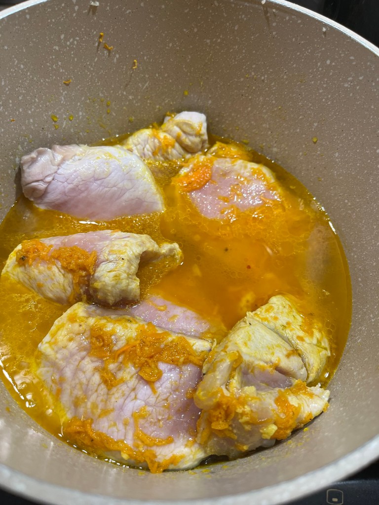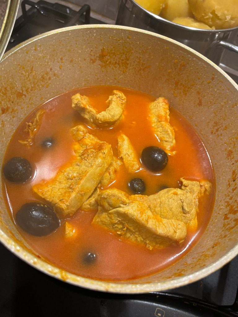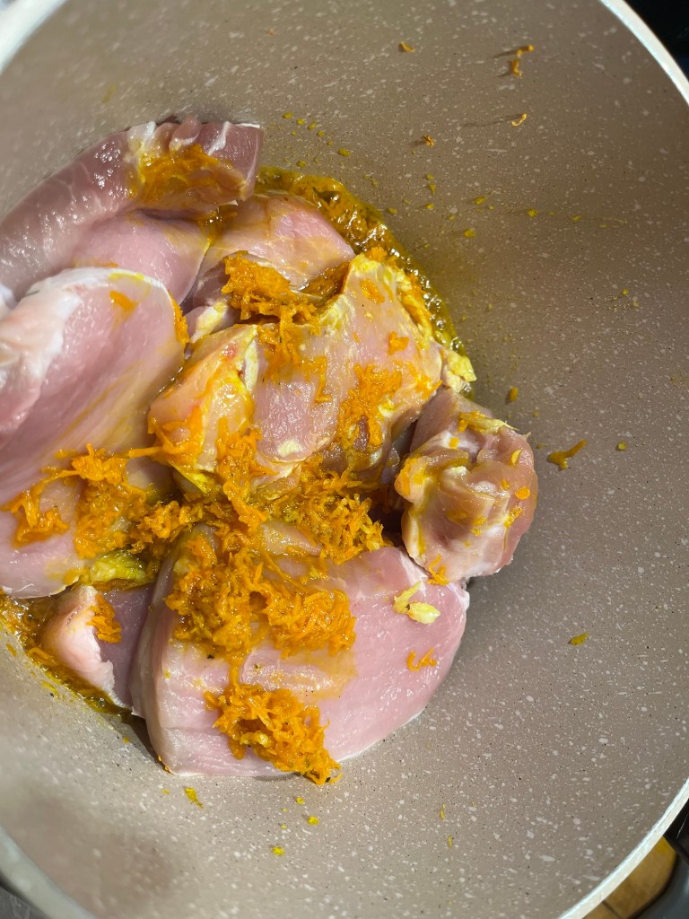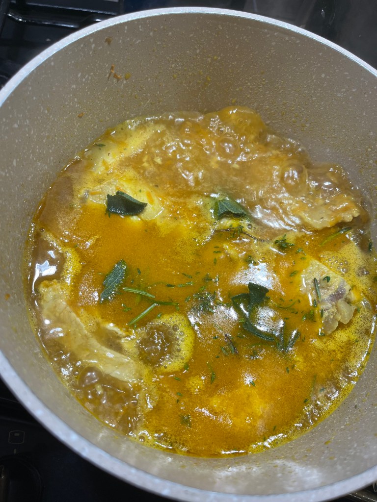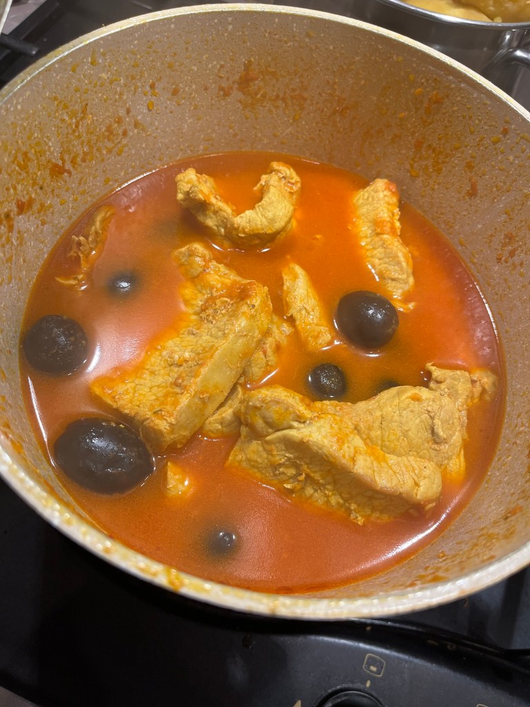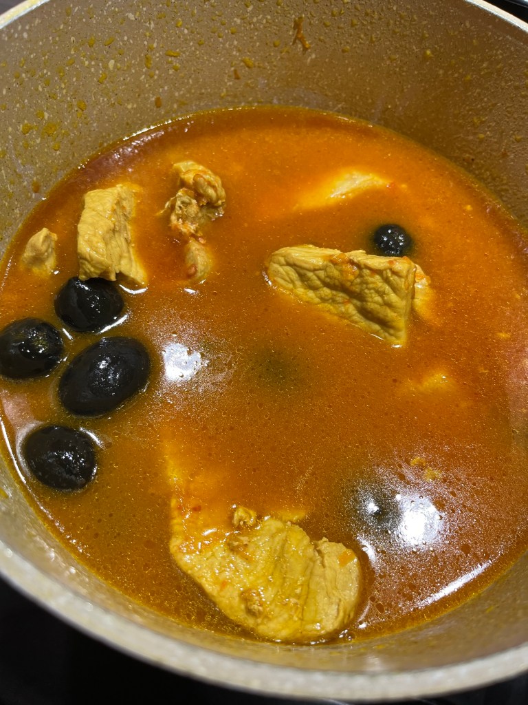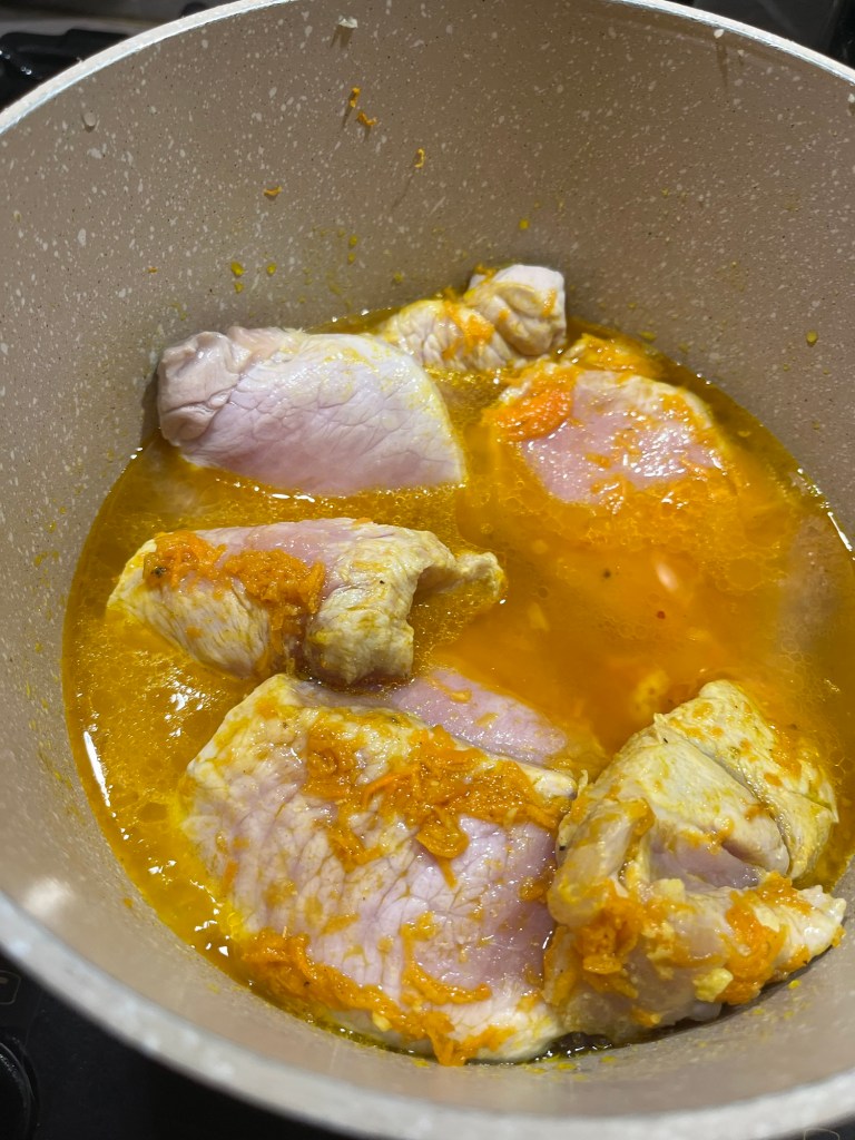 Morcovul, dat prin răzătoarea mică, se prăjeste timp de 5 minute în ulei, cu usturoiul zdrobit și cu praful de Curcuma. Se amestecă, să nu se prindă. Se adaugă feliile de cotlet, se acoperă cu un capac și se lasă să fiarbă până când își lasă apa – cam 7 minute. Se adaugă vreo 6 căni de apă, cimbrul, salvia, rozmarinul, se pune capacul și se lasă să fiarbă, la foc mediu, vreo oră. Trebuie amestecat din când în când. Când carnea este făcută – eu iau și gust – se adaugă sucul de roșii – cam 500 gr – și măslinele și se mai lasă la fiert la foc mic, cu capacul pus, cam 10 minute.