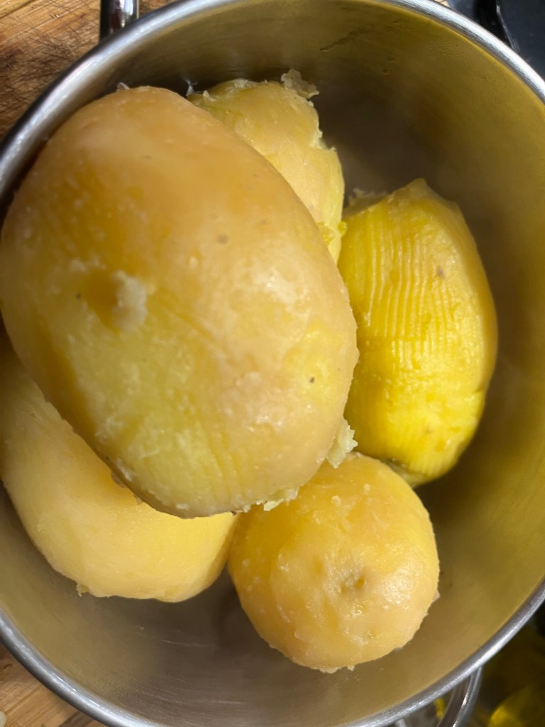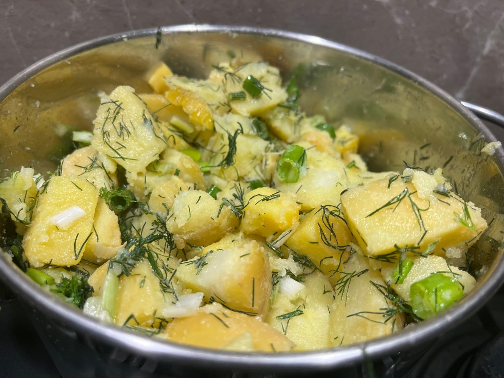 În timp ce carnea se face, se fierb cartofii, în coajă. Când sunt făcuți – eu îi pun la oala cu presiune, cam 12 minute după ce începe aburul să iasă – se răcesc, se curăță de coajă, se taie cuburi, se adaugă ceapa verde tăiată mărunt și mărarul tocat, după care se asezonează cu sare și ulei, după gust.