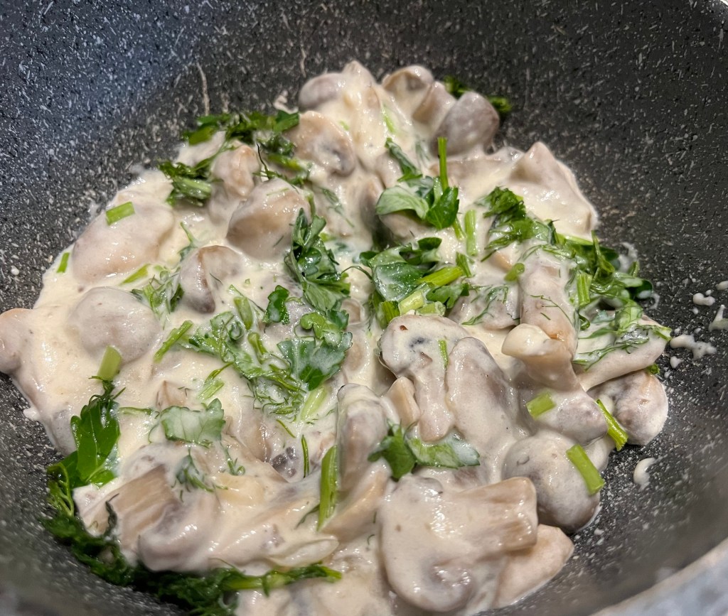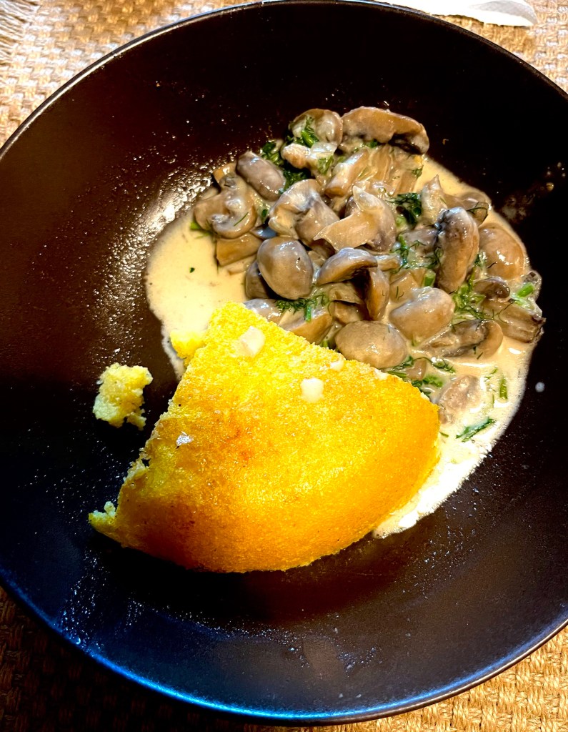 Se taie ceapa cubulețe, usturoiul se zdrobește, se prăjesc, împreună, într-o cratiță, până devin aurii, după care se adaugă ciupercile, tăiate fâșii, se pune un capac și se lasă se fiarbă, până devin ciupercile „al dente”. Se amestecă smântâna cu făina și cu un polonic de zeamă de la ciuperci, se adaugă sare, piper, după gust, și se toarnă peste ciuperci. Mămăliga eu o fac „în coajă” : într-o cratiță cu fund gros se pune apă rece, sare, se toarnă mălai cât să rămână un strat de apă pe deasupra, se amestecă, se pune un capac și se lasă, la foc mediu – mic, până ce mămăliga face crusta și se desprinde de cratiță. Pătrunjelul se adaugă doar la servire, in farfurii.