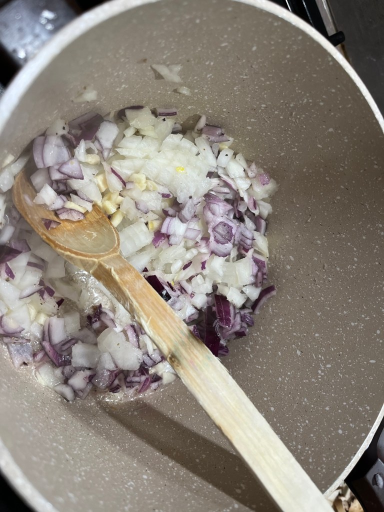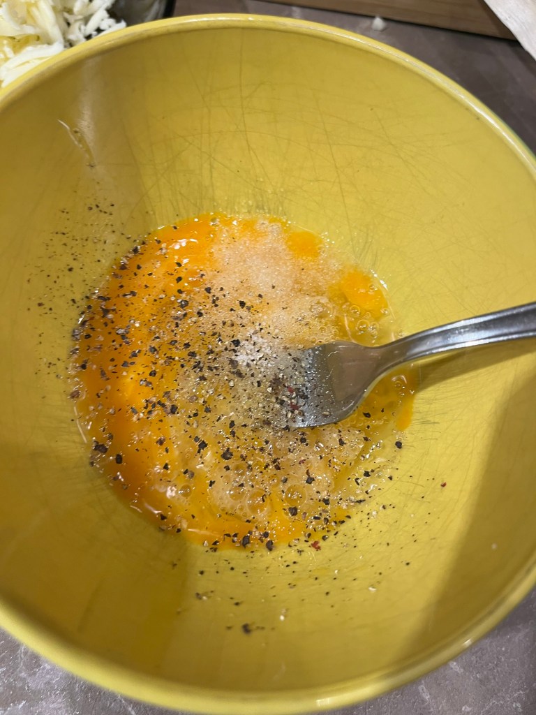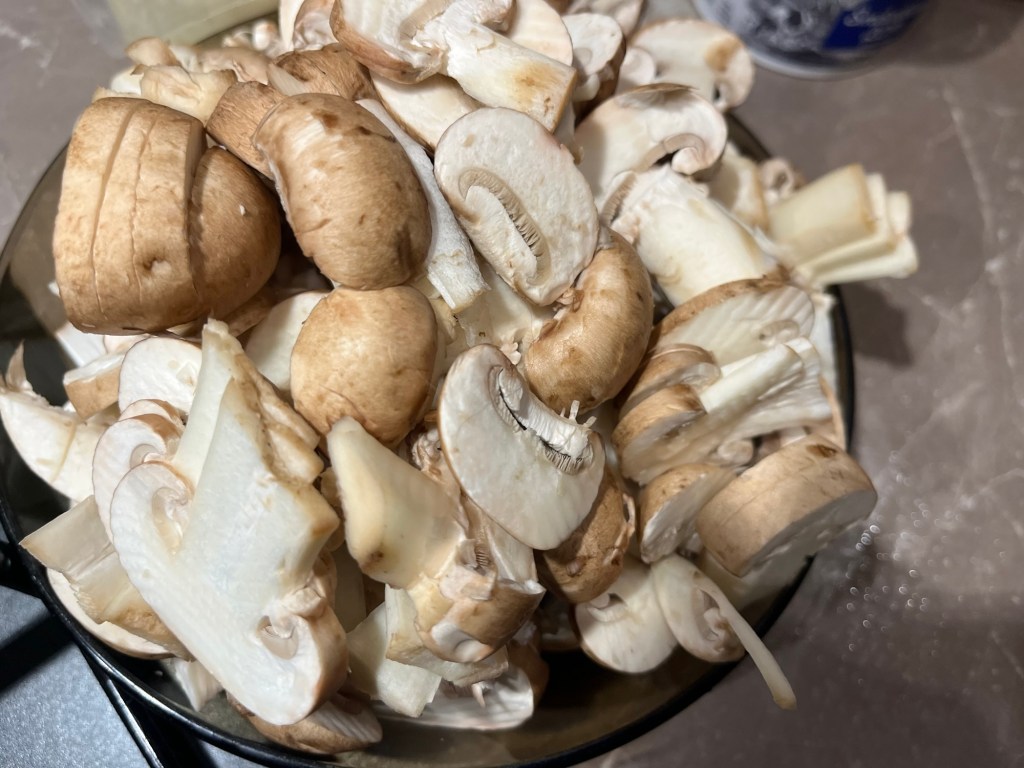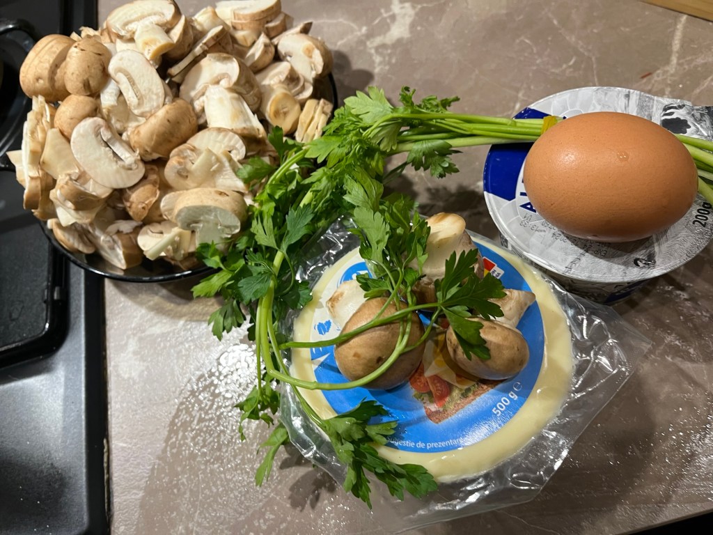 Ceapa și usturoiul se taie în cubulețe și se prăjesc într-o tigaie, cu ulei, până când devin lucioase. Se adaugă sare și piper și ciupercile tăiate mărunt. Se acoperă cu un capac și se lasă la fiert până se elimină toată apa de la ciuperci. În timp ce ciupercile fierb, se amestecă smântâna cu oul și, separat, se rade cașcavalul.