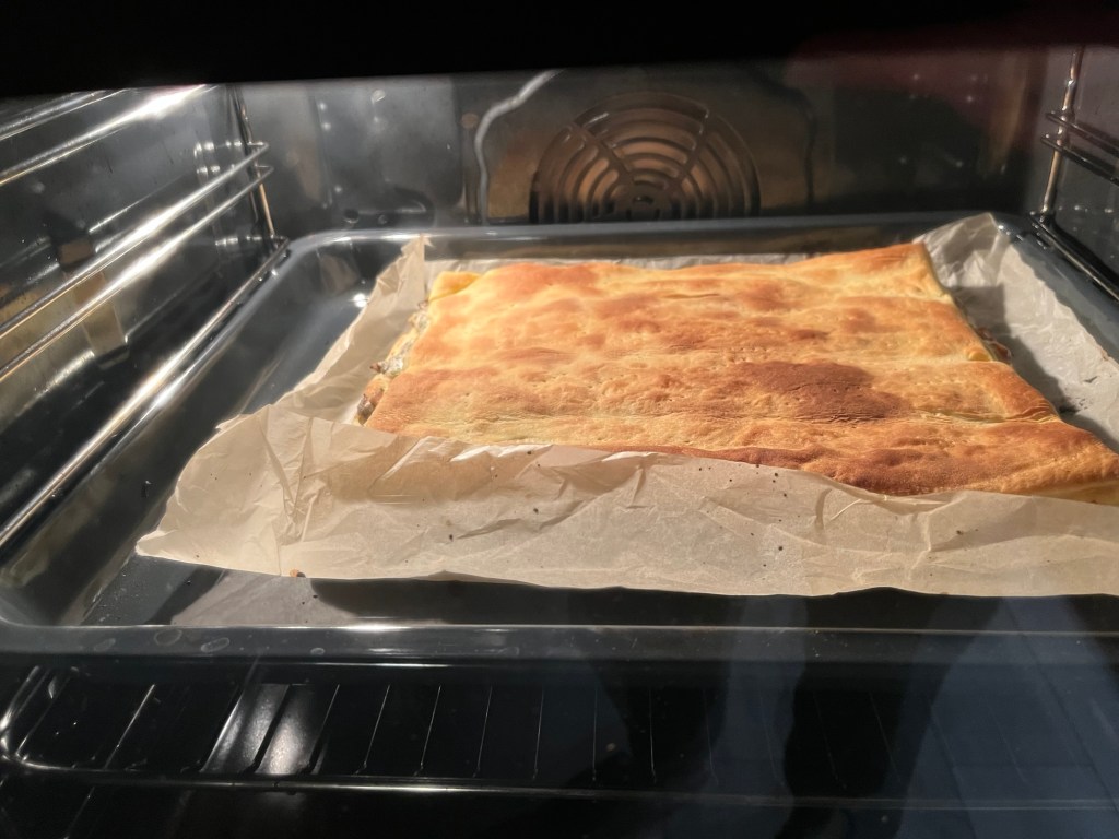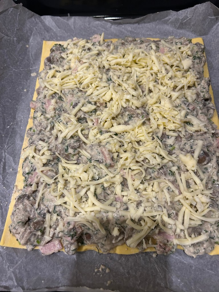 Odată răcit, se întinde peste una dintre foile de aluat, în prealabil înțepată cu furculița. Peste stratul de amestec cu ciuperci se presară cașcavalul ras și se pune a doua foaie de aluat, peste. Se coace timp de 40 de minute în cuptorul preîncălzit, la 200 de grade.