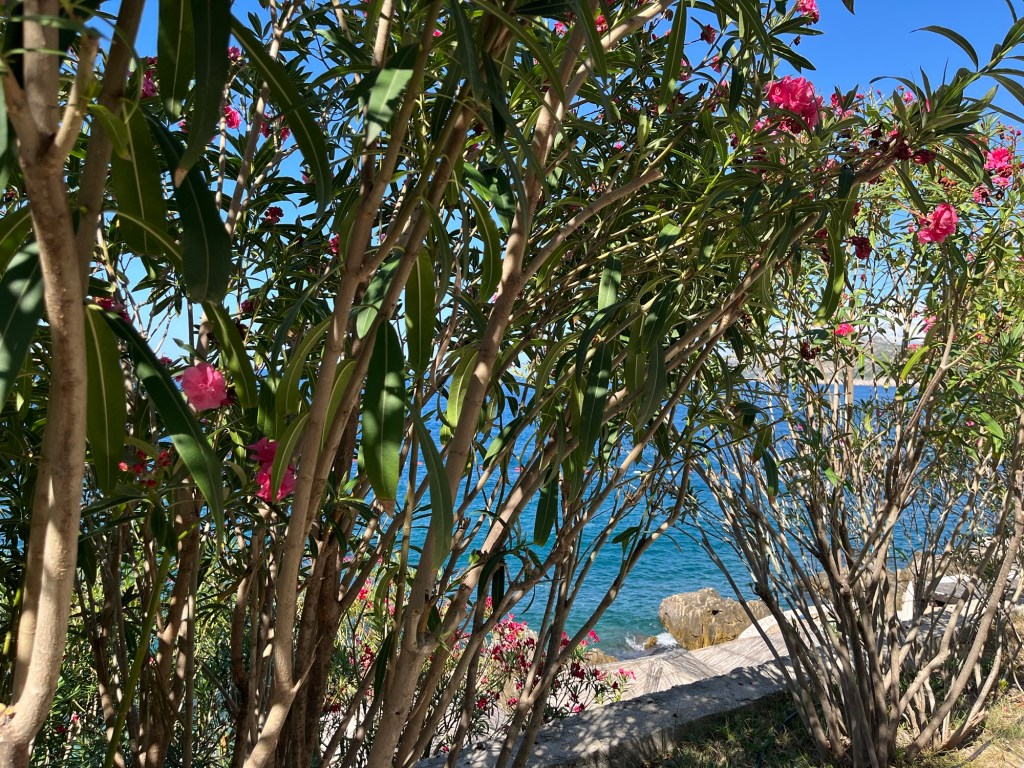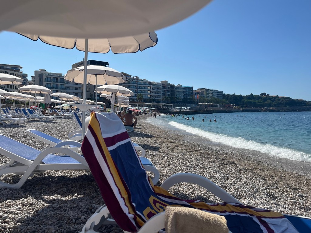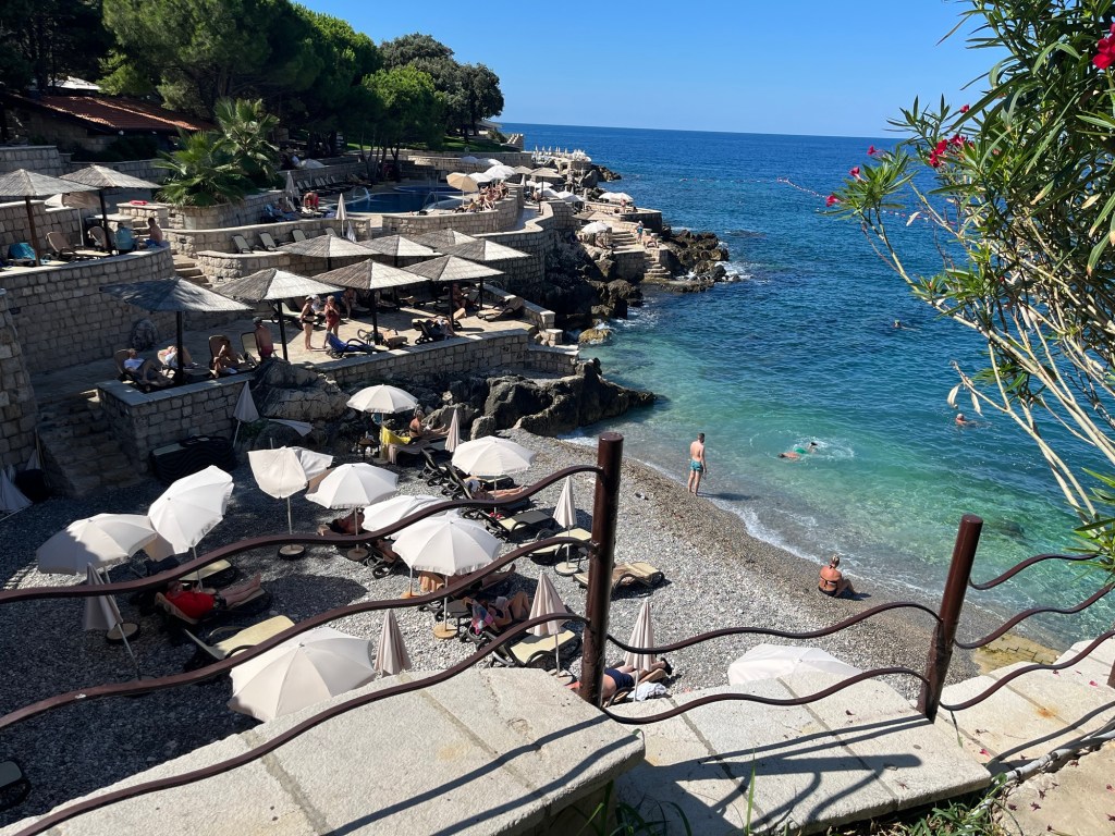 Nu departe de plajă se afla un hotel de cinci stele (525 euro pe noapte) cu plajă privată – un fel de-a spune plajă, mai degrabă o stâncă privată pe care erau așezate chaise-longue – cu intrare în mare ca la piscină, pe scară.