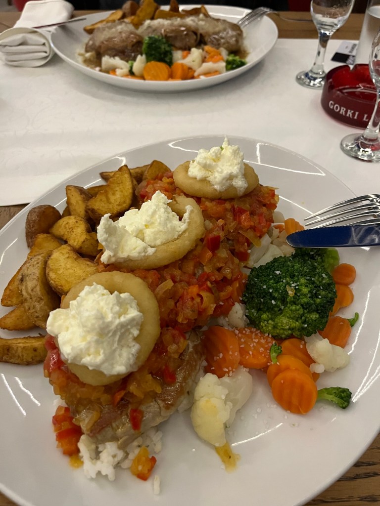 În drum spre Muntenegru, la acel motel simpatic, eu îmi luasem inițial pui cu sos de ciuperci, dar mi s-au părut mult mai gustoase frigăruile de porc cu cartofi prăjiți, comandate de soț.