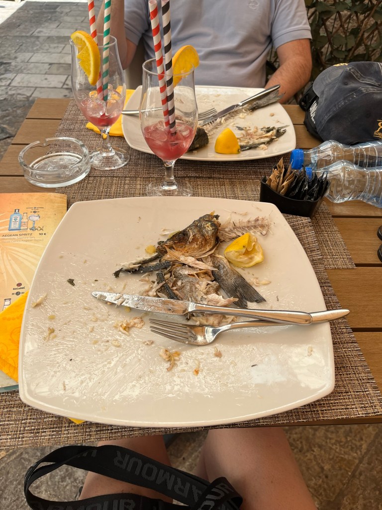 În Kotor am mâncat tot un biban prăjit – tot întreg, dar mai mic, acompaniat de o minuscula lingură de salată de cartofi cu praz.