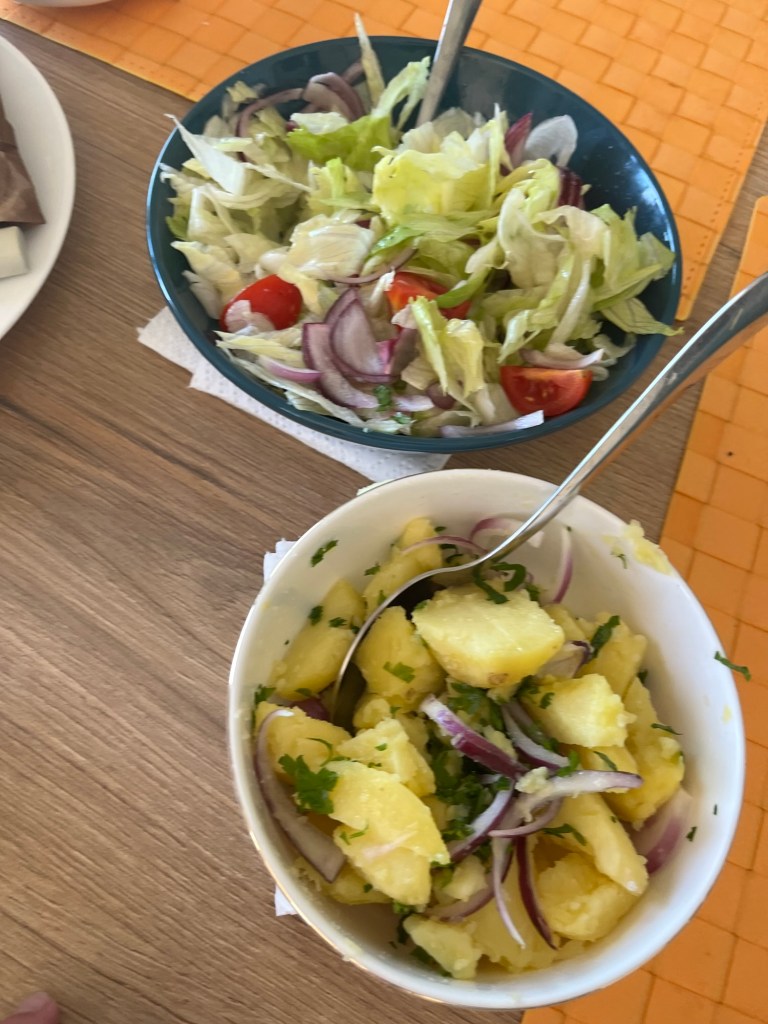3) salată cu roșii, ceapa roșie și ulei de măsline – produs în casă