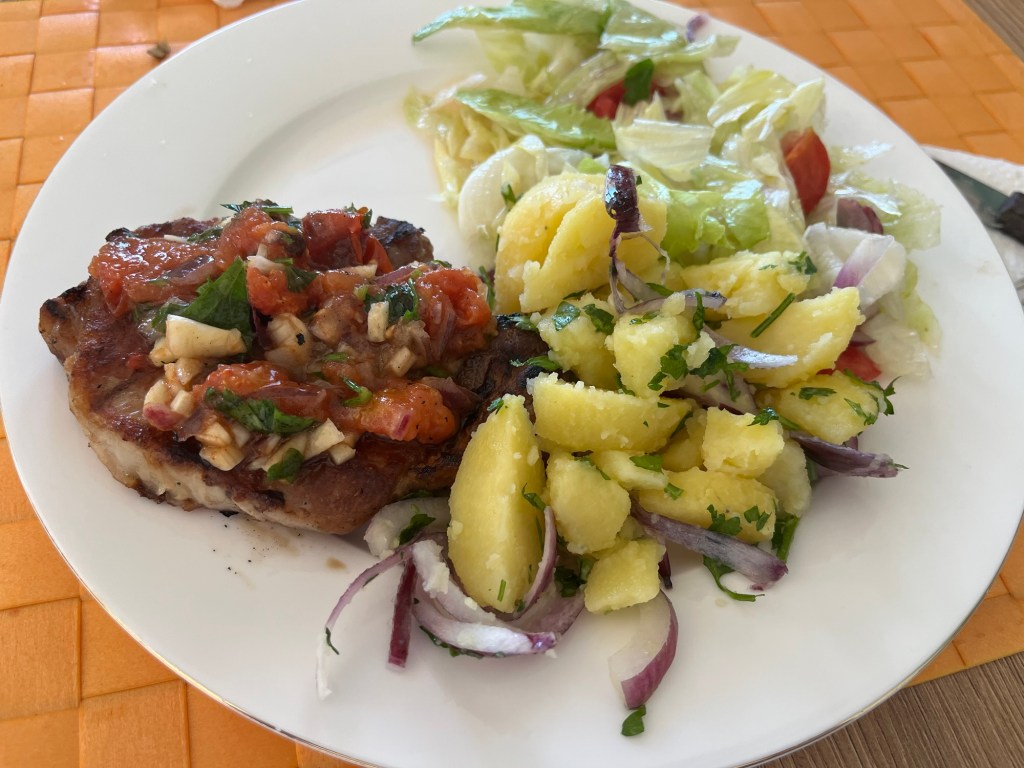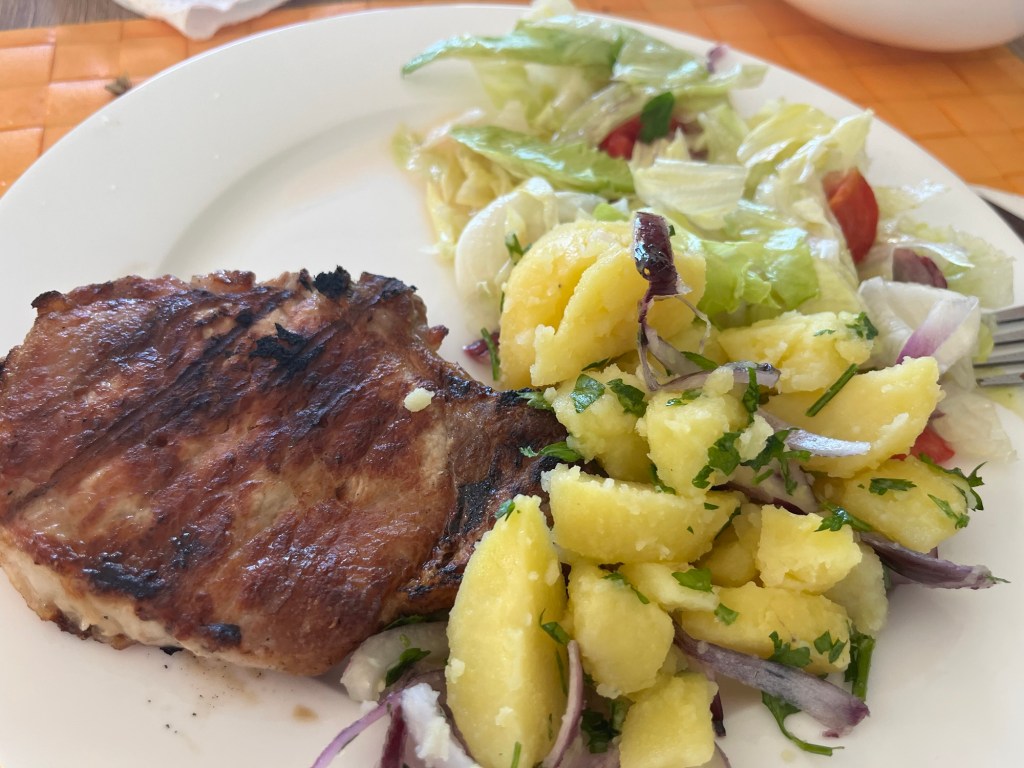 1) cotlet de porc cu os, servit cu salată de cartofi fierți, ceapa roșie, pătrunjel și sos sârbesc (sic).